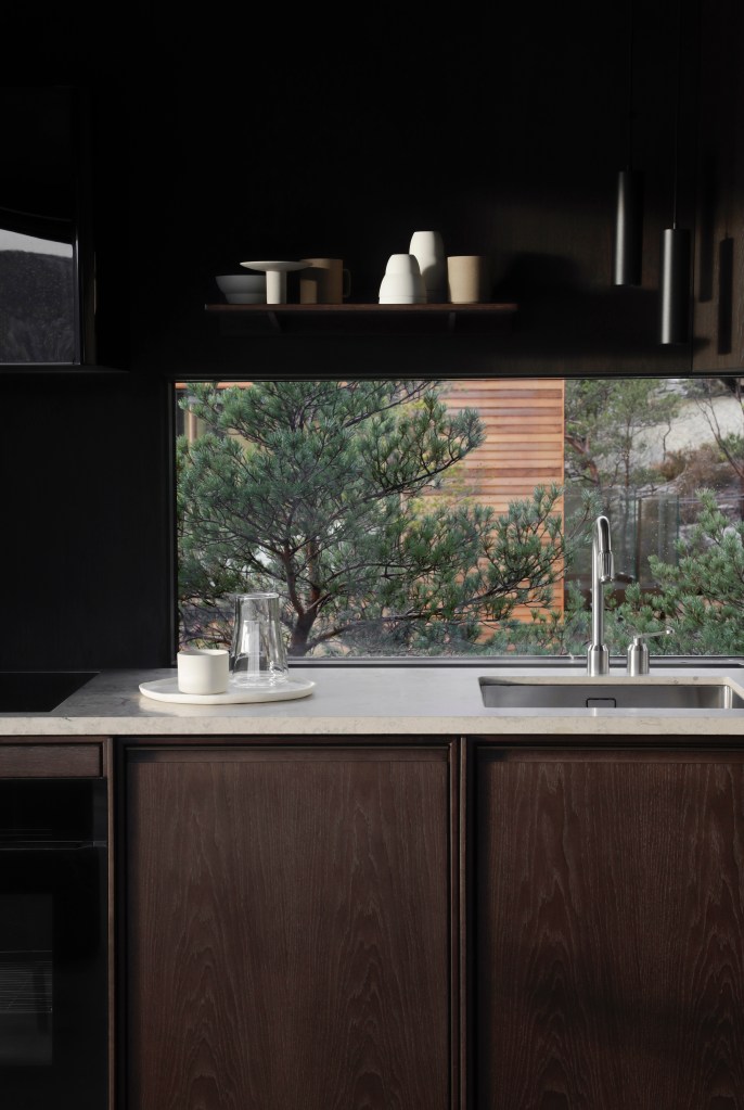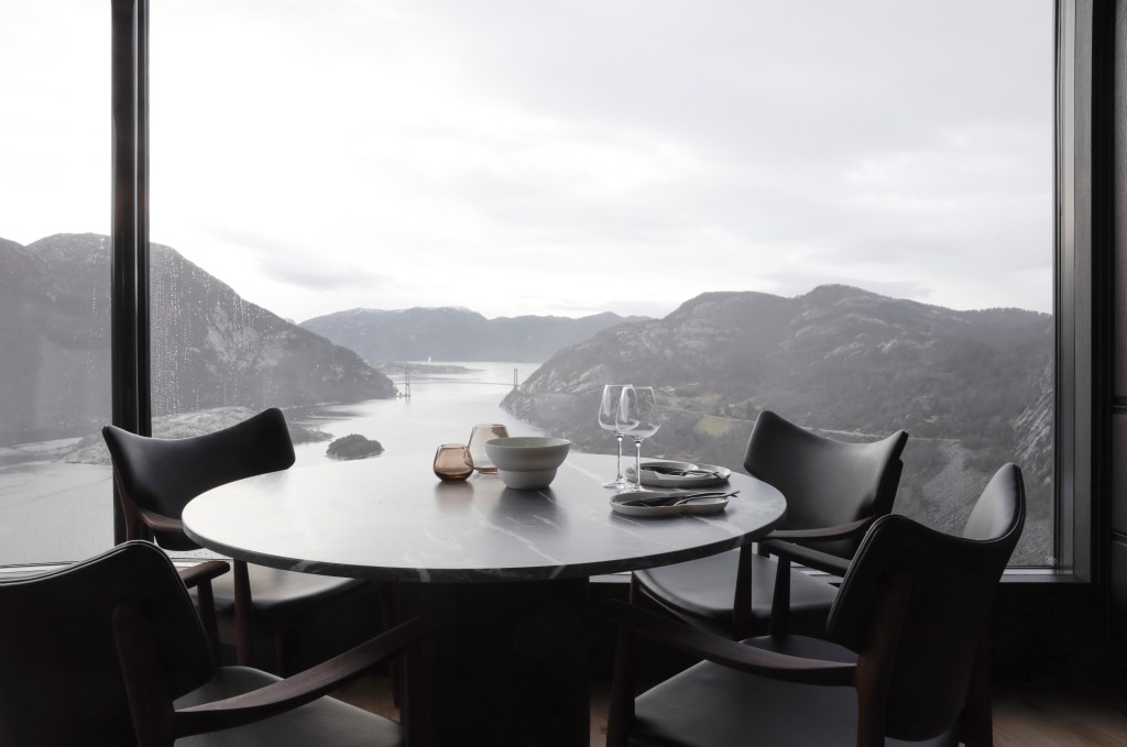 Når du kommer inn i hyttene, får du nettopp den følelsen av å flyte i luften med uavbrutt utsikt over Lysefjorden og fjell fylt av Bonsai-lignende furutrær. Denne følelsen av natur, er dratt inn i hyttene, som er innredet med et minimalistisk ethos i bunn. Naturlige og bærekraftige materialer i jordaktige farger og organiske teksturer dominerer interiørvalgene. Hyttene har alle en overetasje med kjøkken