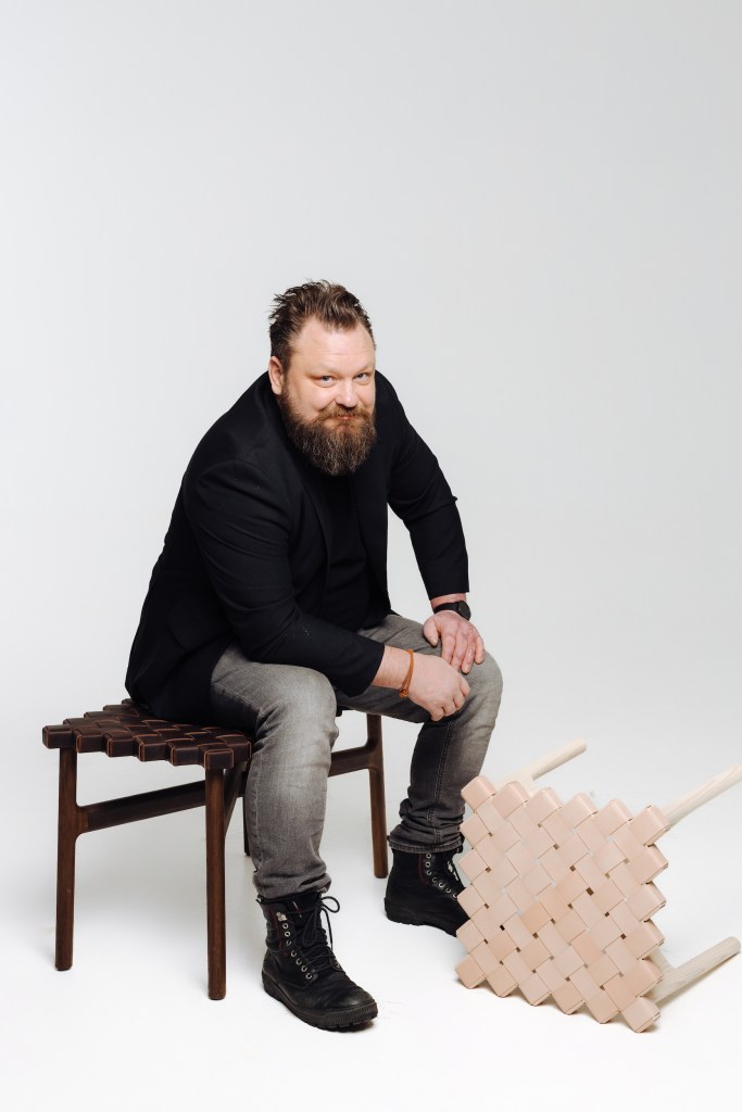 Sami Kallio har skapt en benk i røkt eik og lær fra Tärnsjö garveri, og en krakk i ask og lær fra Tärnsjö garveri, som har fått navnet Pixel. Foto: Alina Berkovskaia.