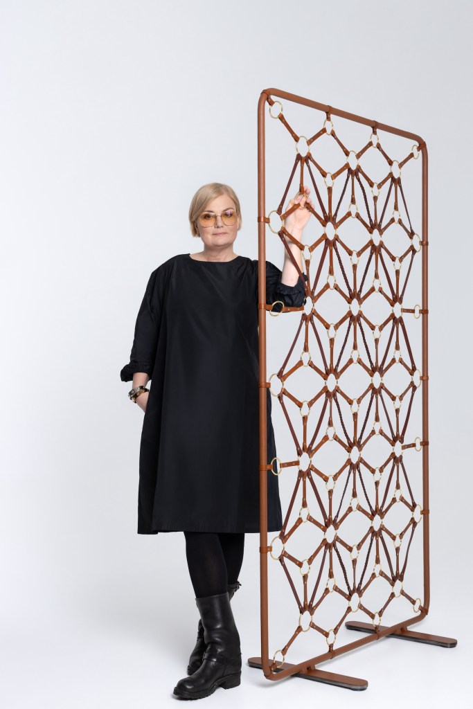 – Hester har alltid hatt en spesiell plass i hjertet til Anki Gneib. Som ung tilbrakte hun mye tid i stallen, med å stelle hester og vedlikeholde utstyr. Romdeleren Piaff, er en hyllest til Tärnsjö garveris røtter, deres ekspertise innen seletøy og kjærlighet til hester. Foto: Alina Berkovskaia.