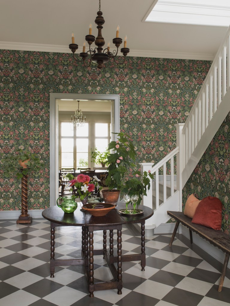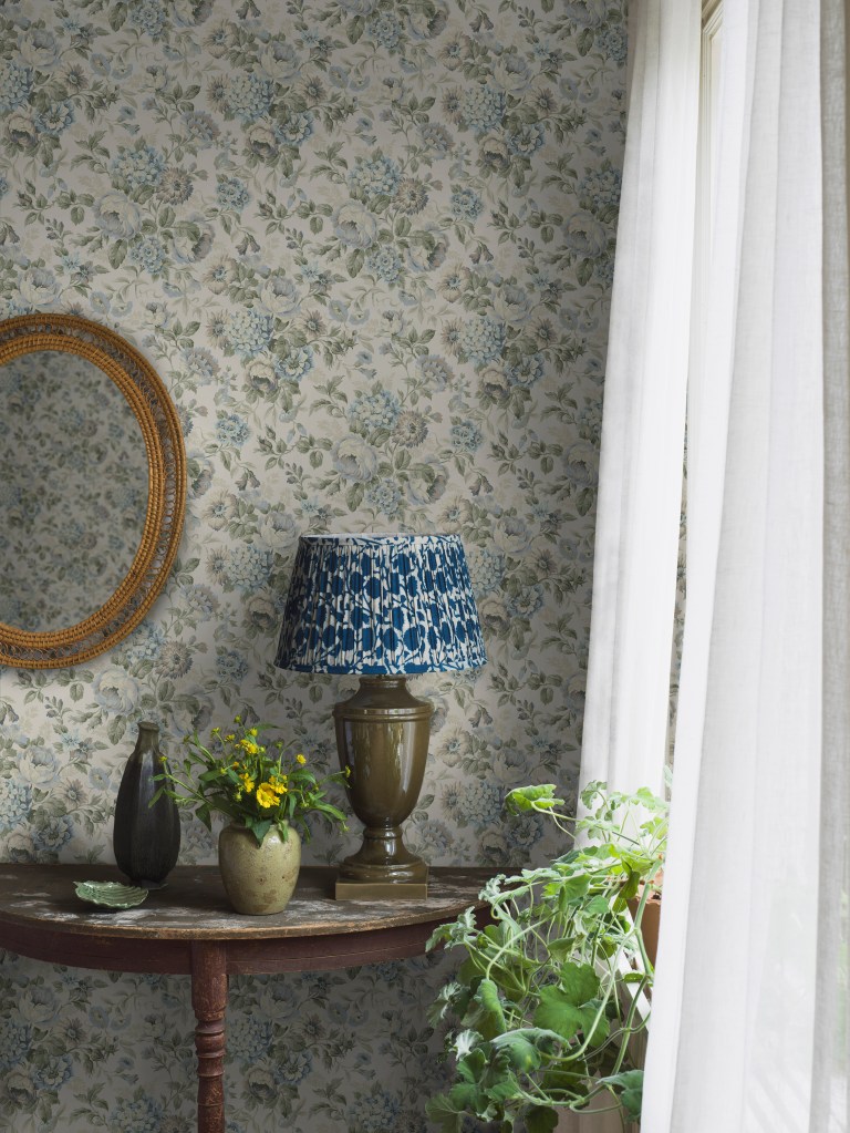 Örtagård er inspirert av medisinske vekster og urter. Nyperoser, valmuer, solhatt, kamomille, timian og marikåpe danner en uttrykksfull følelse som leder tankene til Arts & Crafts-æraens dekorative og ofte speilvendte mønsterbilder. Tapetet finnes i fem fargekombinasjoner, fra pudderaktige pasteller som gir rommet en poetisk og romantisk stemning, til dunkle og mørke toner som tilfører liv og energi.Det livlige, håndmalte tapetet Blåregn gjør at rommet føles luftig, levende og harmonisk. Mønsteret er inspirert av den vakre klatreveksten med samme navn. Blåregn, som har sitt opphav i Asia, er som aller vakrest om våren da de blålilla blomstene slår ut i blomst og sprer en duft av vanilje. Tapetet finnes i fem ulike fargesammensetninger. Hortensia er et søtt og klassisk tapet hentet fra Boråstapeters gedigne arkiv. Mønsteret ble skapt i 1975, men føles like aktuelt i dag som nå. Den naturalistiske følelsen er høyst nærværende, med håndmalte buketter av hortensia, dahlia, roser og busknellik. Tapetet som finnes i tre fargekombinasjoner som passer like bra i et tradisjonelt, klassisk interiør som i et mer moderne et.Citronträd finnes i tre ulike fargesammensetninger, blant annet i mørk grønn med innslag av rosahvite blomster og gule sitroner.Slyngende grener, vakkert løvverk, gule sitroner, sommerfugler og små blomster. Citronträd er et tapet som utånder sol og varme. Tapetet er inspirert av Arts & Crafts-bevegelsens detaljrike mønstre, men med en større luftighet som passer fint inn i dagens moderne hjem.Dahliadröm er et mønster som består av en klassisk, stormønstret blomsterslynge som gir rommet en dekorativ og luftig atmosfære. Tapetet er inspirert av mønstre fra 1700- og tidlig 1800-tallet og har den nydelige blomsten Dahlia Café au Lait som motiv. Dahliadröm finnes i tre ulike fargekombinasjoner.Tapetet Myrten gir rommet et ensfarget inntrykk og når du nærmer deg veggen oppdager du et dekorativt og vakkert blomstermønster. Motivet er hentet fra myrtens tette bladverk og hvite blomster og knopper. Det småmønstrede tapetet finnes i seks ulike fargekombinasjoner, og er ekstra fin i kombinasjon med brystningspanel.Kameliablomman, eller ”den japanske rosen” som den også kalles, er inspirasjonen til dette tapetet med akvarellfølelse. Her slynger kameliatreets grener og bladverk sammen med kamelia, krysantemum og granatepleblomster. Det håndmalte mønsteret er både moderne og klassisk med en drømmeaktig vintagefølelse. Tapetet finnes i to fargekombinasjoner og er inspirert av 1700-tallets chinoisemalte vegger og Kameliahuset i Gøteborg, der et tusentalls kameliaer blomstrer hvert år.Det velkomponerte og Arts & Crafts-inspirerte tapetet Olivträd, leder med sitt rustikke uttrykk og tette mønster tankene til Sør-Europa, der oliventreet er en selvfølgelig del av landskapet. Det er et mønster som gir en harmonisk bakgrunn til hjemmets interiør. Tapetet finnes i tre fargekombinasjoner.